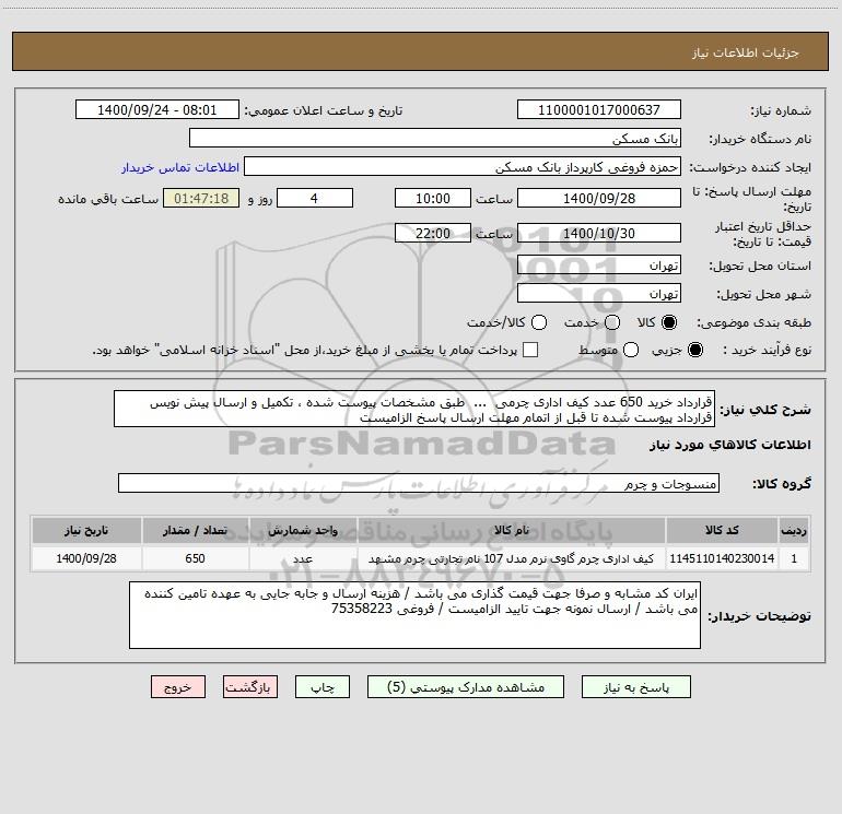 شرح کلی نیاز: قرارداد خرید 650 عدد کیف اداری چرمی ... طبق مشخصات پیوست شده ، تکمیل و ارسال پیش نویس قرارداد پیوست شده تا قبل از اتمام مهلت ارسال پاسخ الزامیست