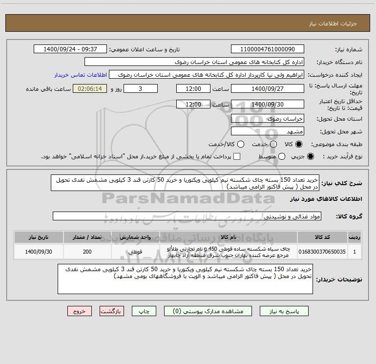 شرح کلی نیاز: خرید تعداد 150 بسته چای شکسته نیم کیلویی ویکتوریا و خرید 50 کارتن قند 3 کیلویی مشمش نقدی تحویل در محل ( پیش فاکتور الزامی میباشد)