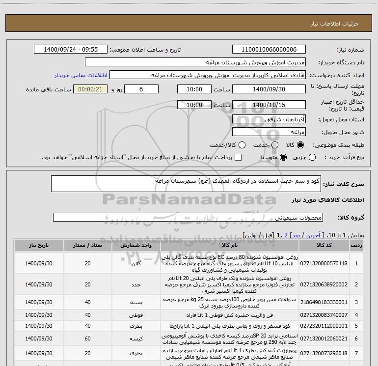 شرح کلی نیاز: کود و سم جهت استفاده در اردوگاه المهدی (عج) شهرستان مراغه