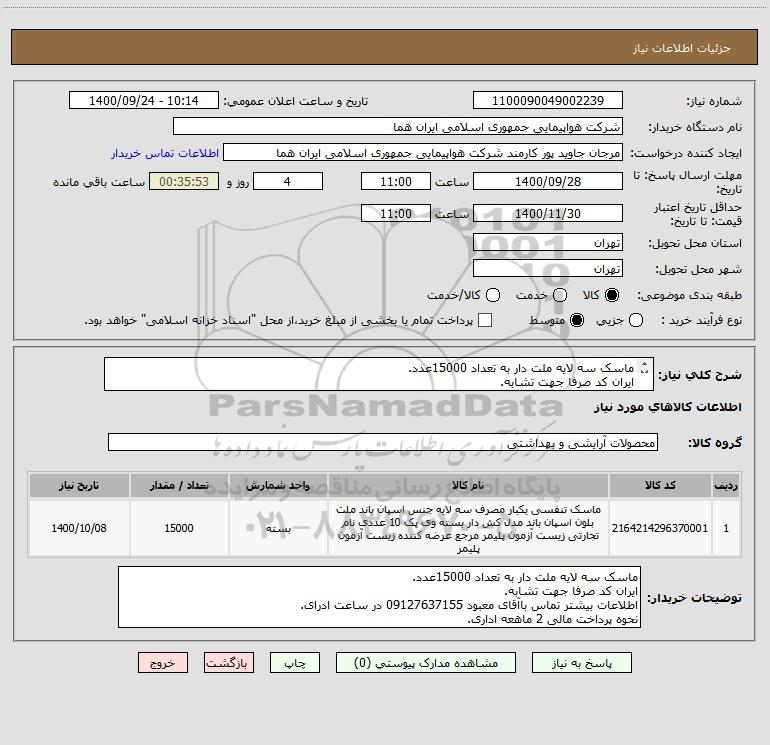 شرح کلی نیاز: ماسک سه لایه ملت دار به تعداد 15000عدد. ایران کد صرفا جهت تشابه. اطلاعات بیشتر توضیحات مطالعه شود.