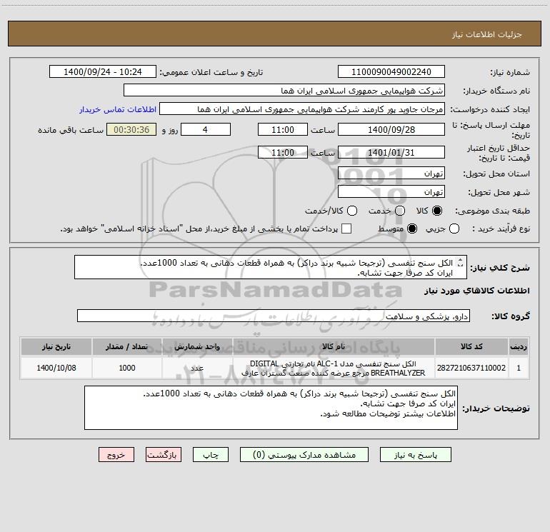 نام دستگاه خریدار:شرکت هواپیمایی جمهوری اسلامی ایران هما
