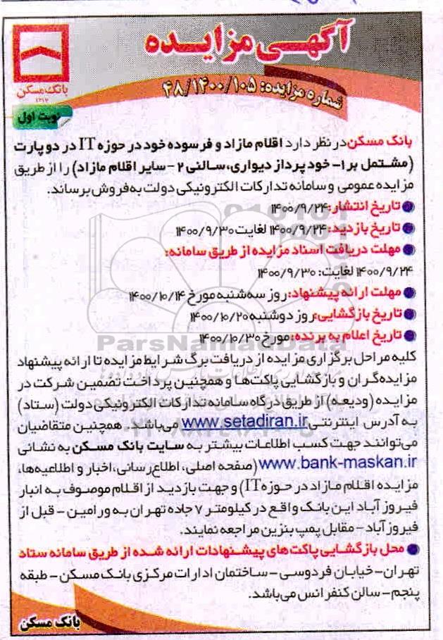 بانک مسکن در نظر دارد اقلام مازاد و فرسوده خود در حوزه IT (شامل دو پارت مشتمل بر 1- خودپرداز دیواری، سالنی2- سایر اقلام مازاد ) را از طریق مزایده عمومی و سامانه تدارکات الکترونیکی دولت به فروش برساند