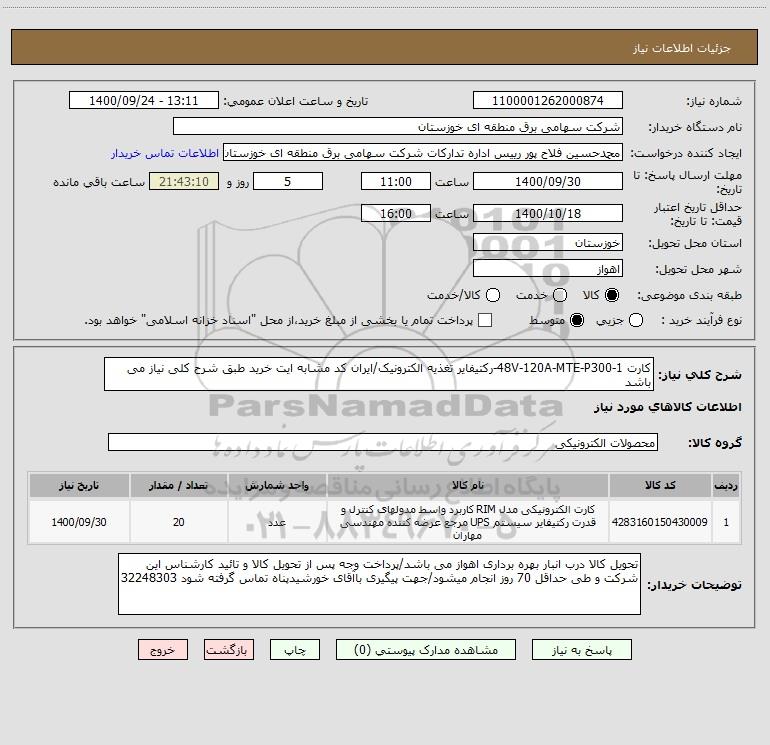 شرح کلی نیاز: کارت 48V-120A-MTE-P300-1-رکتیفایر تغذیه الکترونیک/ایران کد مشابه ایت خرید طبق شرح کلی نیاز می باشد