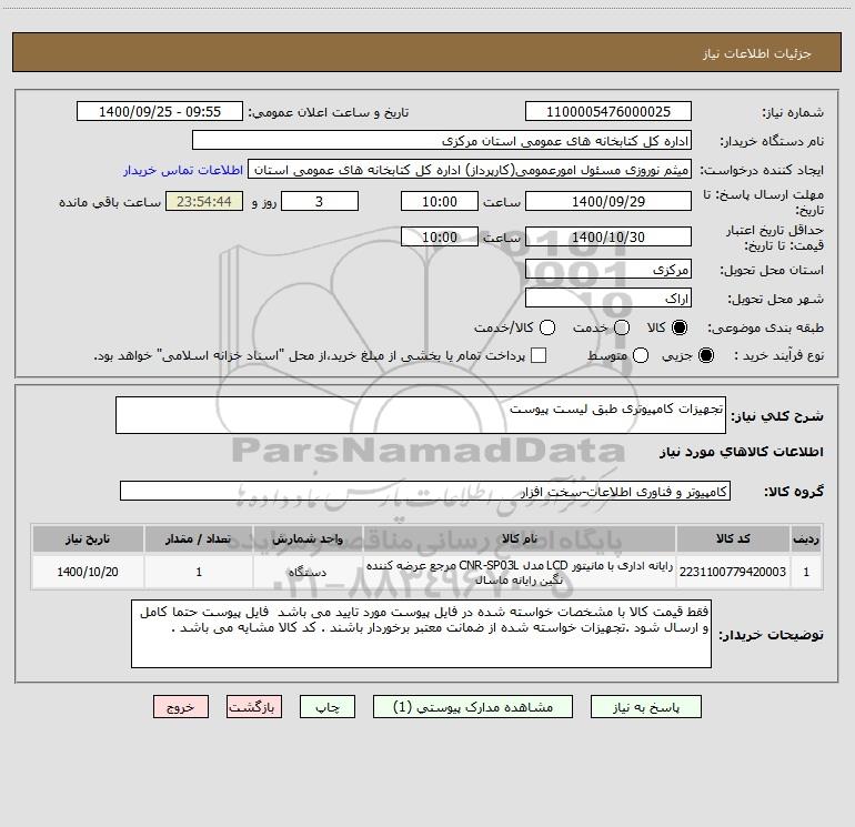 شرح کلی نیاز: تجهیزات کامپیوتری طبق لیست پیوست