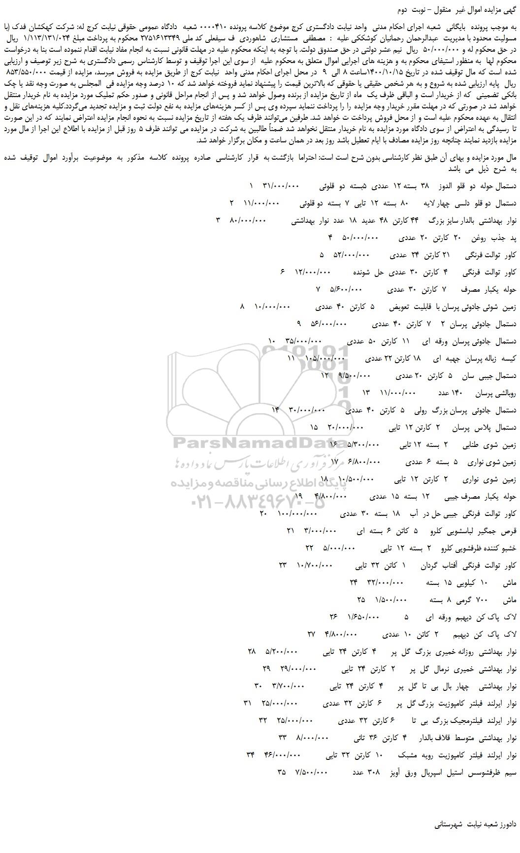 مال مورد مزایده و بهای آن طبق نظر کارشناسی بدون شرح است است: احتراما بازگشت به قرار کارشناسی صادره پرونده کلاسه مذکور به موضوعیت برآورد اموال توقیف شده به شرح ذیل می باشد