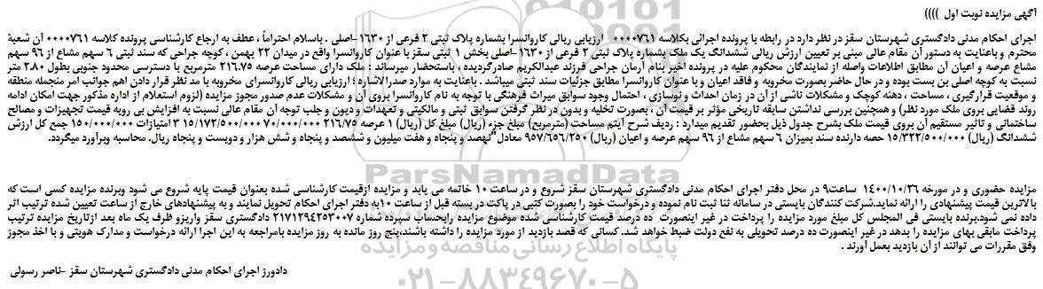 اجرای احکام مدنی دادگستری شهرستان سقز در نظر دارد در رابطه با پرونده اجرائی بکلاسه 0000761 ارزیابی ریالی کاروانسرا بشماره پلاک ثبتی 2 فرعی از 1630-اصلی . باسلام احتراماً ، عطف به ارجاع کارشناسی پرونده کلاسه 0000761 آن شعبۀ محترم و باعنایت به دستور آن مقام عالی مبنی بر تعیین ارزش ریالی ششدانگ یک ملک بشماره پلاک ثبتی 2 فرعی از 1630-اصلی بخش 1 ثبتی سقز با عنوان کاروانسرا واقع در میدان 22 بهمن ، کوچه جراحی که سند ثبتی 6 سهم مشاع از 96 سهم مشاع عرصه و اعیان آن مطابق اطلاعات واصله از نمایندگان محکوم علیه در پرونده اخیر بنام آرمان جراحی فرزند عبدالکریم صادرگردیده ، باستحضار میرساند : ملک دارای مساحت عرصه 216.75 مترمربع با دسترسی محدود جنوبی بطول 2.80 متر نسبت به کوچه اصلی بن بست بوده و در حال حاضر بصورت مخروبه و فاقد اعیان و با عنوان کاروانسرا مطابق جزئیات سند ثبتی میباشد . باعنایت به موارد صدرالاشاره ؛ ارزیابی ریالی کاروانسرای مخروبه با مد نظر قرار دادن اهم جوانب امر منجمله منطقه و موقعیت قرارگیری ، مساحت ، دهنه کوچک و مشکلات ناشی از آن در زمان احداث و نوسازی ، احتمال وجود سوابق میراث فرهنگی با توجه به نام کاروانسرا بروی آن و مشکلات عدم صدور مجوز مزایده (لزوم استعلام از اداره مذکور جهت امکان ادامه روند قضایی بروی ملک مورد نظر) و همچنین بررسی نداشتن سابقه تاریخی مؤثر بر قیمت آن ، بصورت تخلیه و بدون در نظر گرفتن سوابق ثبتی و مالکیتی و تعهدات و دیون و جلب توجه آن مقام عالی نسبت به افزایش بی رویه قیمت تجهیزات و مصالح ساختمانی و تاثیر مستقیم آن بروی قیمت ملک بشرح جدول ذیل بحضور تقدیم میدارد : ردیف شرح آیتم مساحت (مترمربع) مبلغ جزء (ریال) مبلغ کل (ریال) 1 عرصه 216/75 70/000/000 15/172/500/000 3 امتیازات 150/000/000 جمع کل ارزش ششدانگ (ریال) 15/322/500/000 حصه دارنده سند بمیزان 6 سهم مشاع از 96 سهم عرصه و اعیان (ریال) 957/656/250 معادل"نهصد و پنجاه و هفت میلیون و ششصد و پنجاه و شش هزار و دویست و پنجاه ریال. محاسبه وبرآورد میگردد.