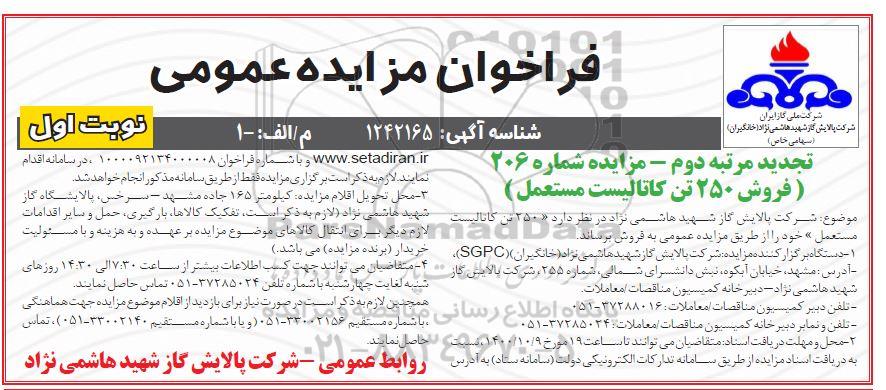 موضوع: شرکت پالایش گاز شهید هاشمی نژاد در نظر دارد 250 تن کاتالیست مستعمل خود را از طریق مزایده عمومی به فروش برساند.