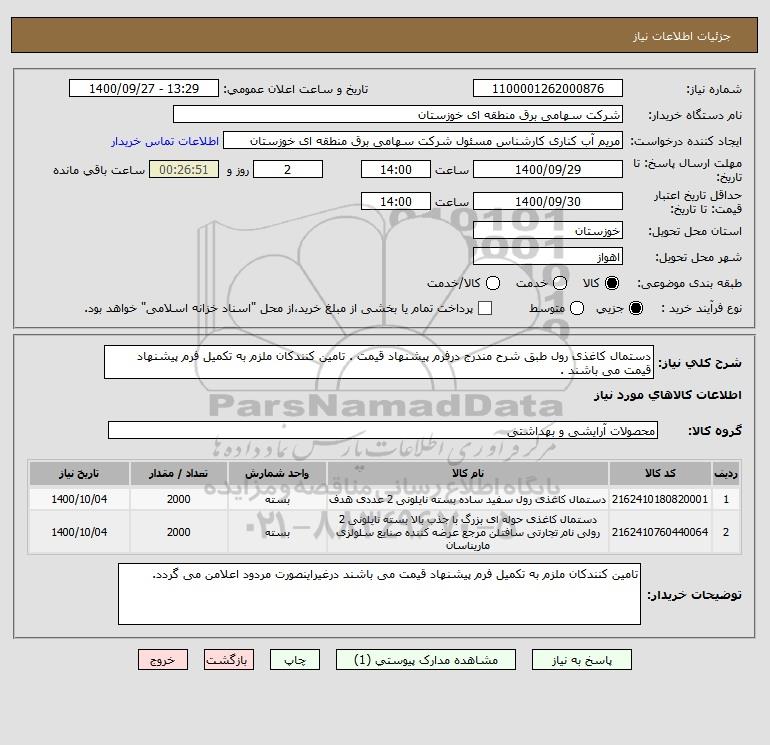 شرح کلی نیاز: دستمال کاغذی رول طبق شرح مندرج درفرم پیشنهاد قیمت . تامین کنندکان ملزم به تکمیل فرم پیشنهاد قیمت می باشند .