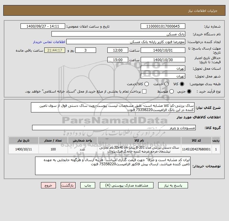 شرح کلی نیاز: ساک برزنتی-کد کالا مشابه است- طبق مشخصات لیست پیوست-رویت ساک دستی فوق از سوی تامین کننده در این بانک الزامیست75358220 فتوت