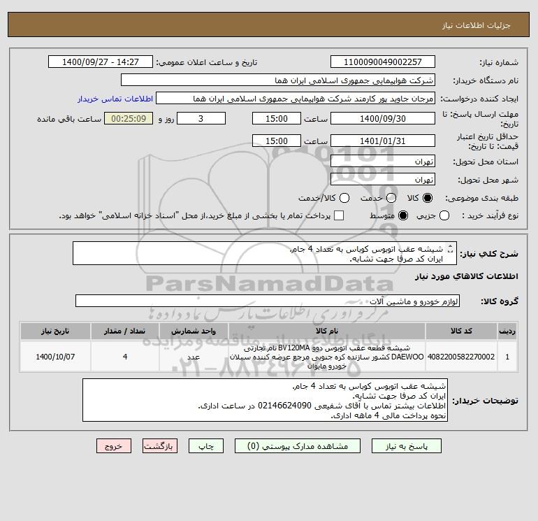 شرح کلی نیاز: شیشه عقب اتوبوس کوباس به تعداد 4 جام.