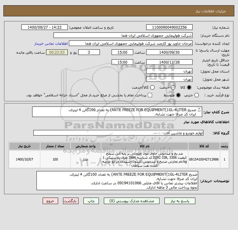 توضیحات خریدار:ضدیخ ANTE FREEZE FOR EQUIPMENT(1GL-4LITER) به تعداد 100گالن 4 لیتری. ایران کد صرفا جهت تشابه. اطلاعات بیشتر تماس با آقای مایلی 09194101066 در ساعت اداری. نحوه پرداخت مالی 3 ماهه اداری.