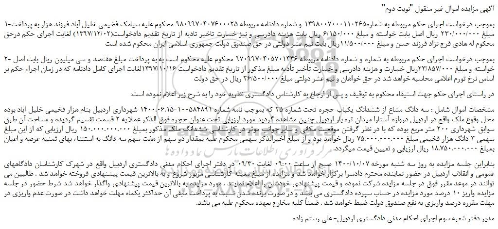 "آگهی مزایده اموال غیر منقول "نوبت دوم