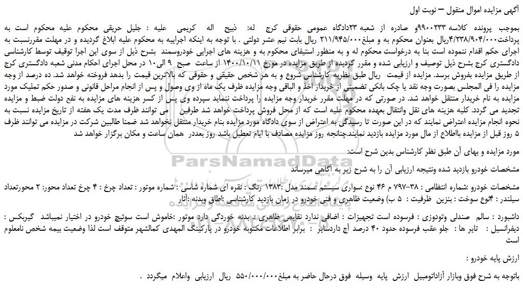 بموجب پرونده کلاسه 9900233و صادره از شعبه 23دادگاه عمومی حقوقی کرج له: ذبیح اله کریمی علیه : جلیل حریقی محکوم علیه محکوم است به پرداخت4/238/904/000ریال بعنوان محکوم به و مبلغ211/945/000 ریال بابت نیم عشر دولتی . با توجه به اینکه اجراییه به محکوم علیه ابلاغ گردیده و در مهلت مقررنسبت به اجرای حکم اقدام ننموده است بنا به درخواست محکوم له و به منظور استیفای محکوم به و هزینه های اجرایی خودروسمند بشرح ذیل از سوی این اجرا توقیف توسط کارشناسی دادگستری کرج بشرح ذیل توصیف و ارزیابی شده و مقرر گردیده از طریق مزایده در مورخ 1400/10/11 از ساعت صبح 9 الی10 در محل اجرای احکام مدنی شعبه دادگستری کرج از طریق مزایده بفروش برسد. مزایده از قیمت ریال طبق نظریه کارشناس شروع و به هر شخص حقیقی و حقوقی که بالاترین قیمت را بدهد فروخته خواهد شد. ده درصد از وجه مزایده را فی المجلس بصورت وجه نقد یا چک بانکی تضمینی از خریدار اخذ و الباقی وجه مزایده ظرف یک ماه از وی وصول و پس از انجام مراحل قانونی و صدور حکم تملیک مورد مزایده به نام خریدار منتقل خواهد شد. در صورتی که در مهلت مقرر خریدار وجه مزایده را پرداخت ننماید سپرده وی پس از کسر هزینه های مزایده به نفع دولت ضبط و مزایده تجدید می گردد. کلیه هزینه های نقل وانتقال بعهده محکوم علیه است که از محل فروش پرداخت خواهد شد طرفین می توانند ظرف مدت یک هفته از تاریخ مزایده نسبت به نحوه انجام مزایده اعتراض نمایند که در این صورت تا رسیدگی به اعتراض از سوی دادگاه مورد مزایده بنام خریدار منتقل نخواهد شد ضمنا طالبین شرکت در مزایده می توانند ظرف 5 روز قبل از مزایده بااطلاع از مال مورد مزایده بازدید نمایند.چنانجه روز مزایده مصادف با ایام تعطیل باشد روز بعددر همان ساعت و مکان برگزار خواهد شد