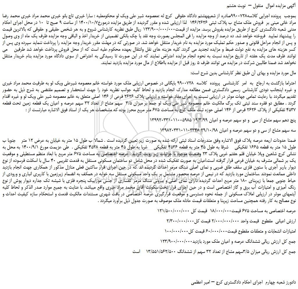 بموجب پرونده اجرایی کلاسه9900728صادره از شعبههشتم دادگاه حقوقی کرج له :معصومه شیر علی ویک لو محکومعلیه : سارا خیری تاج بانو خیری محمد مراد خیری محمد رضا مراد خانی مبنی بر فروش ملک مشاع ب پلاک ثبتی 146/2626 لذا ارزیابی شده و مقرر گردیده از طریق مزایده درمورخ1400/10/7 از ساعت 9 صبح تا 10 در محل اجرای احکام مدنی شعبه دادگستری کرج از طریق مزایده بفروش برسد. مزایده از قیمت123/900/000/000 ریال طبق نظریه کارشناس شروع و به هر شخص حقیقی و حقوقی که بالاترین قیمت را پیشنهاد نمایید فروخته خواهد شد. ده درصد از وجه مزایده را فی المجلس بصورت وجه نقد یا چک بانکی تضمینی از خریدار اخذ و الباقی وجه مزایده ظرف یک ماه از وی وصول و پس از انجام مراحل قانونی و صدور حکم تملیک مورد مزایده به نام خریدار منتقل خواهد شد. در صورتی که در مهلت مقرر خریدار وجه مزایده را پرداخت ننماید سپرده وی پس از کسر هزینه های مزایده به نفع دولت ضبط و مزایده تجدید می گردد. کلیه هزینه های نقل وانتقال بعهده محکوم علیه است که از محل فروش پرداخت خواهد شد طرفین می توانند ظرف مدت یک هفته از تاریخ مزایده نسبت به نحوه انجام مزایده اعتراض نمایند که در این صورت تا رسیدگی به اعتراض از سوی دادگاه مورد مزایده بنام خریدار منتقل نخواهد شد ضمنا طالبین شرکت در مزایده می توانند ظرف 5 روز قبل از مزایده بااطلاع از مال مورد مزایده بازدید نمایند.