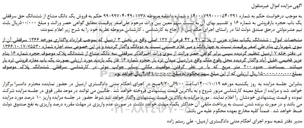 مشخصات اموال : ششدانگ یکباب مغازه جزیی از پلاک 41 و 42 فرعی از 127 اصلی واقع در بخش 3 اردبیل که بموجب قرارداد واگذاری مورخه 1366 سرقفلی آن از سوی شهرداری بنام علی اصغر پرقیمت نسبت به چهاردانگ و میر غلام حسینی نسبت به دودانگ واگذار گردیده و در این خصوص سند اجاره شماره 75530-1366.10.17 در دفتر خانه 7 اردبیل تنظیم گردیده سپس برابر گواهی حصر وراثت از سوی وراث اخیرالذکر سرقفلی سه دانگ مشاع از ششدانگ پلاک موصوف حجره شماره 16 بنام عزیز فخیمی خلیل آباد واگذار گردیده محل وقوع ملک واقع دراردبیل میدان تره بار حجره شماره 16 فاز یک بازدید مورد ارزیابی بصورت یک باب مغازه فروشی تره بار میباشد بمساحت حدود 200 متر مربع که با در نظر گرفتن موقعیت مکانی وسایر جوانب موثر در کارشناسی سرقفلی ششدانگ پلاک موصوف بمبلغ150.000.000.000ریال ارزیابی که از این مبلغ سهم محکوم له مبلغ 4.861.000.000ریال خواهد بود