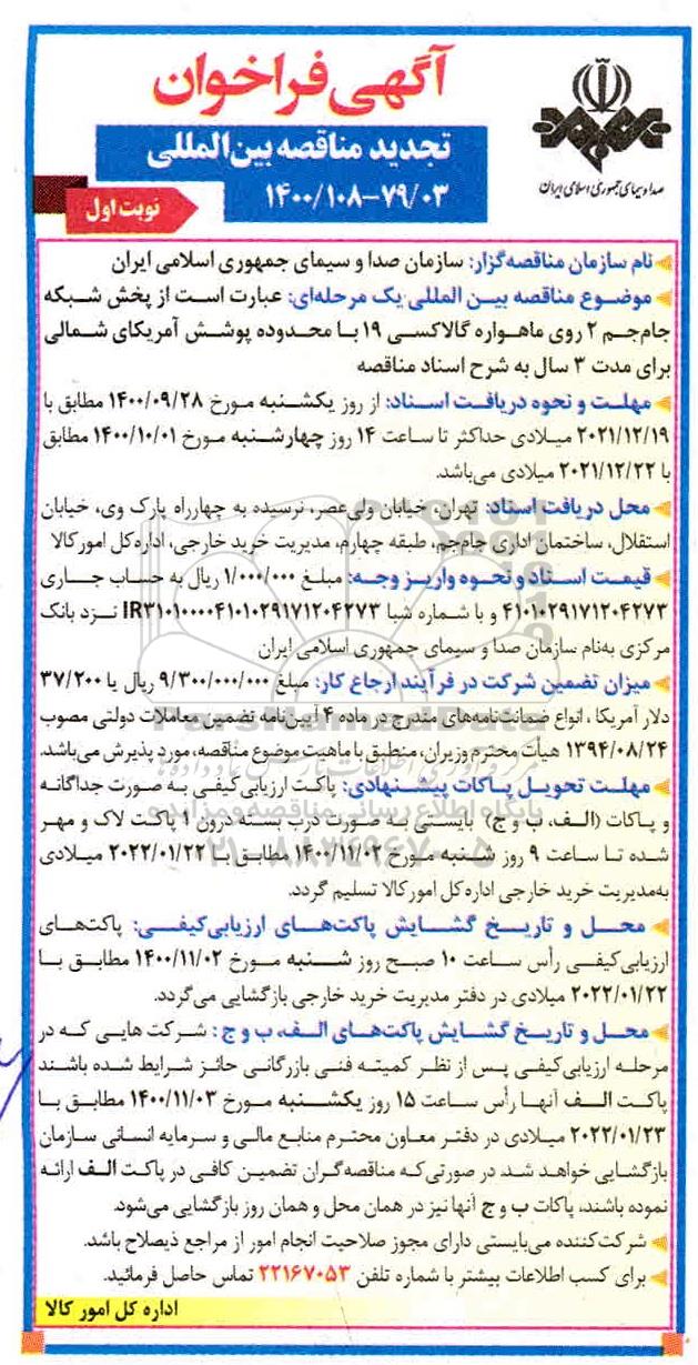 - موضوع مناقصه بین المللی یک مرحله ای: عبارت است از پخش شبکه جام جم 2 روی ماهواره گالاکسی 19 با محدوده پوشش آمریکای شمالی برای مدت 3 سال به شرح اسناد مناقصه