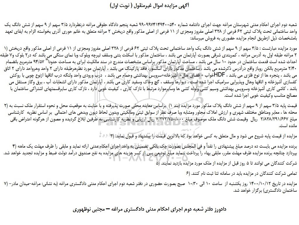 شعبه دوم اجرای احکام مدنی شهرستان مراغه جهت اجرای دادنامه شماره 9909974149400540 شعبه پنجم دادگاه حقوقی مراغه درنظردارد 3/5 سهم از 9 سهم از شش دانگ یک واحد ساختمانی تحت پلاک ثبتی 62 فرعی از 328 اصلی مفروز ومجزی از 11 فرعی از اصلی مذکور واقع دربخش 2 مراغه متعلق به خانم حوری آذری بخواسته الزام به ایفای تعهد بامشخصات ذیل ازطریق انجام مزایده حضوری به فروش میرساند: