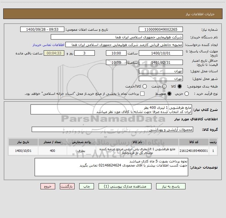 شرح کلی نیاز: مایع ظرفشویی 1 لیتری 400 بطر