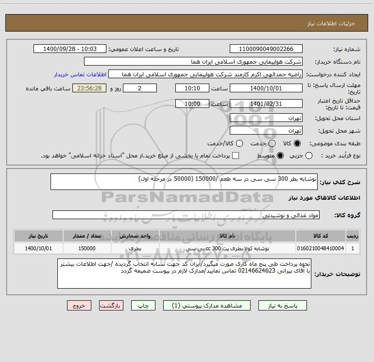 شرح کلی نیاز: نوشابه بطر 300 سی سی در سه طعم /150000 (50000 در مرحله اول)