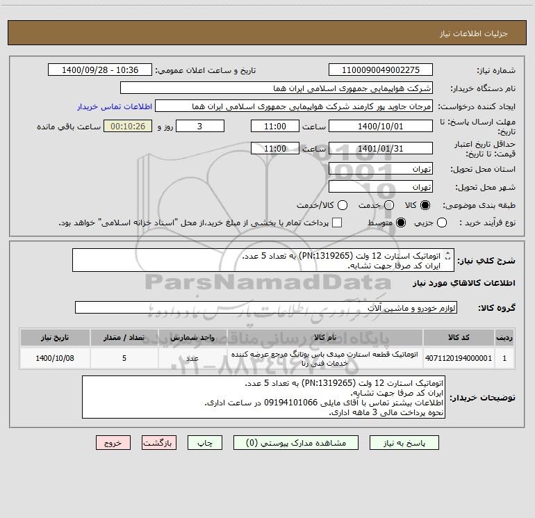 شرح کلی نیاز: اتوماتیک استارت 12 ولت (PN:1319265) به تعداد 5 عدد.