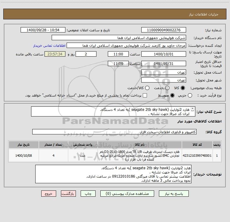 توضیحات خریدار:هارد 2توابایت (seagate 2tb sky hawk )به تعداد 4 دستگاه. ایران کد صرفا جهت تشابه . اطلاعت بیشتر تماس با آقای میرگلی 09122010186 در ساعت اداری. نحوه پرداخت مالی 3 ماهه اداری.