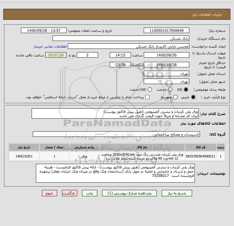 شرح کلی نیاز: ورق پلی کربنات و نبشی آلمینیومی (طبق پیش فاکتور پیوست)