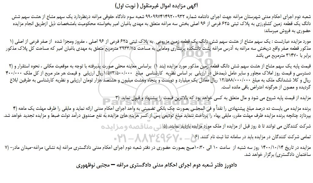 شعبه دوم اجرای احکام مدنی شهرستان مراغه جهت اجرای دادنامه شماره 9909974149200932 شعبه سوم دادگاه حقوقی مراغه درنظردارد یک سهم مشاع از هشت سهم شش دانگ یک قطعه زمین کشاورزی به پلاک ثبتی 625 فرعی از 96 اصلی بخش سه مراغه متعلق به مهدی باغبان امیر بخواسته محکومیت بامشخصات ذیل ازطریق انجام مزایده حضوری به فروش میرساند: