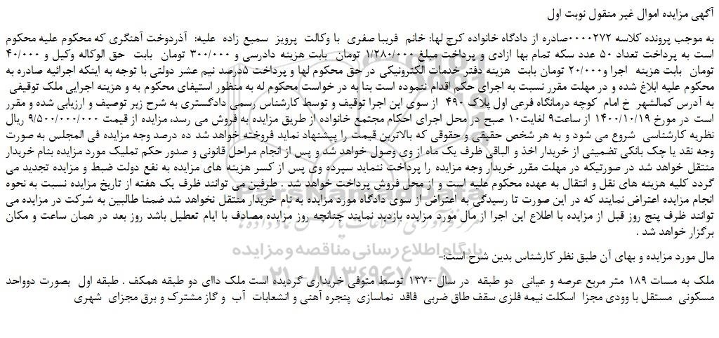 به موجب پرونده کلاسه 0000272صادره از دادگاه خانواده کرج لها: خانم  فریبا صفری  با وکالت  پرویز  سمیع زاده  علیه:  آذردوخت آهنگری که محکوم علیه محکوم است به پرداخت تعداد 50 عدد سکه تمام بها ازادی و پرداخت مبلغ 1/280/000 تومان  بابت هزینه دادرسی و 300/000 تومان  بابت  حق الوکاله وکیل و 40/000 تومان  بابت هزینه  اجرا و20/000 تومان بابت  هزینه دفتر خدمات الکترونیکی در حق محکوم لها و پرداخت 5درصد نیم عشر دولتی با توجه به اینکه اجرائیه صادره به محکوم علیه ابلاغ شده و در مهلت مقرر نسبت به اجرای حکم اقدام ننموده است بنا به در خواست محکوم له به منظور استیفای محکوم به و هزینه اجرایی ملک توقیفی  به آدرس کمالشهر  خ امام  کوچه درمانگاه فرعی اول پلاک 490  از سوی این اجرا توقیف و توسط کارشناس رسمی دادگستری به شرح زیر توصیف و ارزیابی شده و مقرر است در مورخ 1400/10/19 از ساعت9 لغایت10 صبح در محل اجرای احکام مجتمع خانواده از طریق مزایده به فروش می رسد، مزایده از قیمت 9/500/000/000 ریال نظریه کارشناسی  شروع می شود و به هر شخص حقیقی و حقوقی که بالاترین قیمت را پیشنهاد نماید فروخته خواهد شد ده درصد وجه مزایده فی المجلس به صورت وجه نقد یا چک بانکی تضمینی از خریدار اخذ و الباقی ظرف یک ماه از وی وصول خواهد شد و پس از انجام مراحل قانونی و صدور حکم تملیک مورد مزایده بنام خریدار منتقل خواهد شد در صورتیکه در مهلت مقرر خریدار وجه مزایده را پرداخت ننماید سپرده وی پس از کسر هزینه های مزایده به نفع دولت ضبط و مزایده تجدید می گردد کلیه هزینه های نقل و انتقال به عهده محکوم علیه است و از محل فروش پرداخت خواهد شد . طرفین می توانند ظرف یک هفته از تاریخ مزایده نسبت به نحوه انجام مزایده اعتراض نمایند که در این صورت تا رسیدگی به اعتراض از سوی دادگاه مورد مزایده به نام خریدار منتقل نخواهد شد ضمنا طالبین به شرکت در مزایده می توانند ظرف پنج روز قبل از مزایده با اطلاع این اجرا از مال مورد مزایده بازدید نمایند چنانچه روز مزایده مصادف با ایام تعطیل باشد روز بعد در همان ساعت و مکان برگزار خواهد شد .