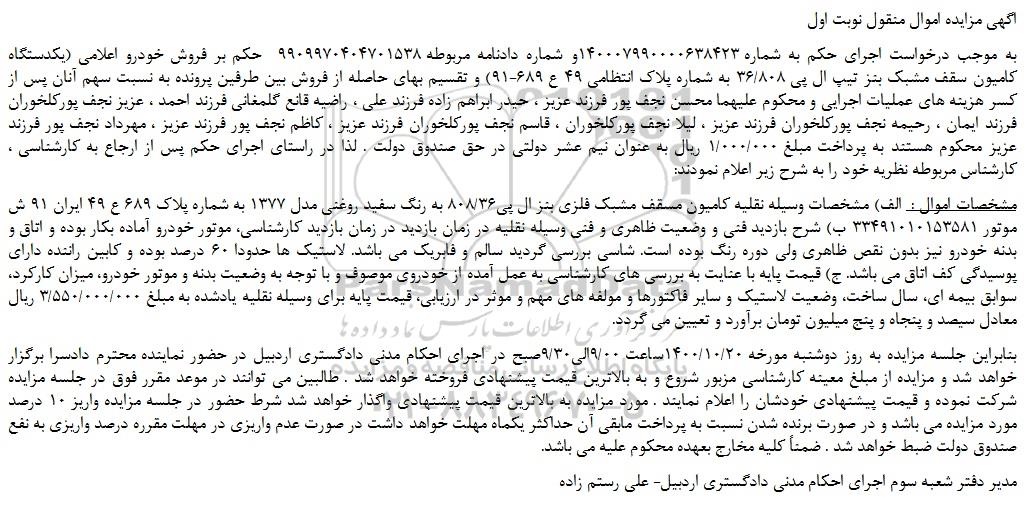 به موجب درخواست اجرای حکم به شماره 140007990000638423و شماره دادنامه مربوطه 9909970404701538 حکم بر فروش خودرو اعلامی (یکدستگاه کامیون سقف مشبک بنز تیپ ال پی 36/808 به شماره پلاک انتظامی 49 ع 689-91) و تقسیم بهای حاصله از فروش بین طرفین پرونده به نسبت سهم آنان پس از کسر هزینه های عملیات اجرایی و محکوم علیهما محسن نجف پور فرزند عزیز ، حیدر ابراهم زاده فرزند علی ، راضیه قانع گلمغانی فرزند احمد ، عزیز نجف پورکلخوران فرزند ایمان ، رحیمه نجف پورکلخوران فرزند عزیز ، لیلا نجف پورکلخوران ، قاسم نجف پورکلخوران فرزند عزیز ، کاظم نجف پور فرزند عزیز ، مهرداد نجف پور فرزند عزیز محکوم هستند به پرداخت مبلغ 1/000/000 ریال به عنوان نیم عشر دولتی در حق صندوق دولت . لذا در راستای اجرای حکم پس از ارجاع به کارشناسی ، کارشناس مربوطه نظریه خود را به شرح زیر اعلام نمودند: