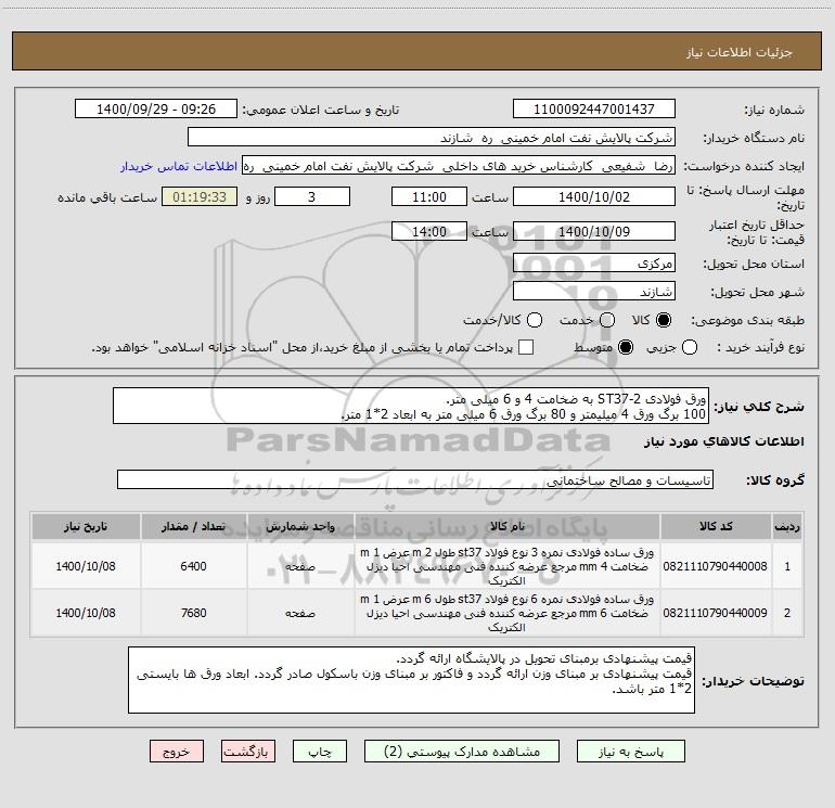شرح کلی نیاز: ورق فولادی ST37-2 به ضخامت 4 و 6 میلی متر. 100 برگ ورق 4 میلیمتر و 80 برگ ورق 6 میلی متر به ابعاد 2*1 متر.
