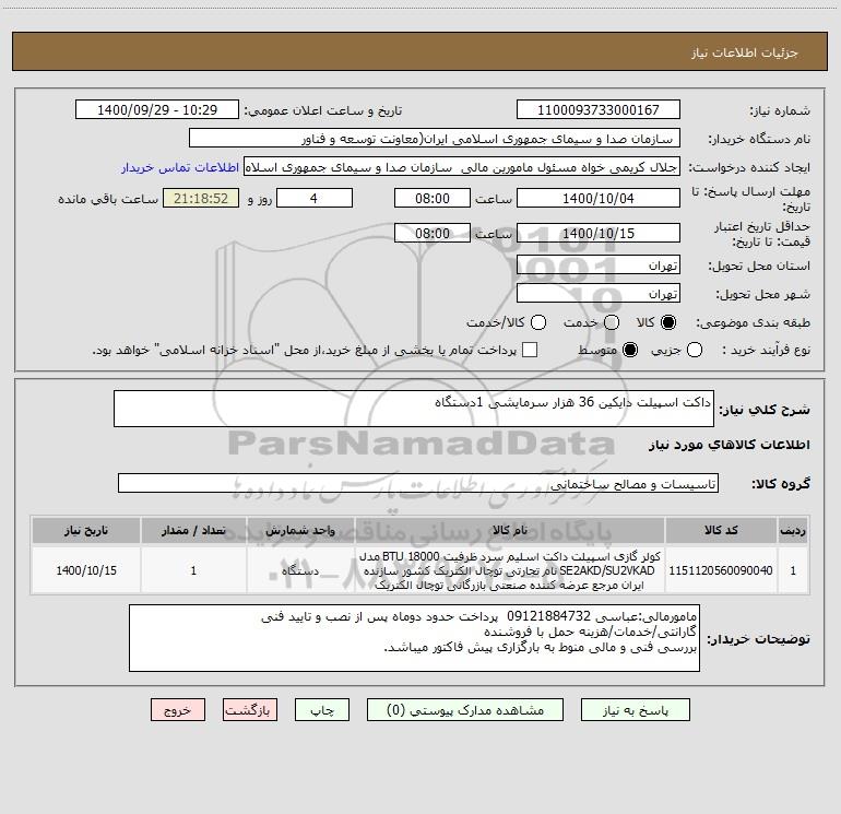 استعلام داکت اسپیلت دایکین 36 هزار سرمایشی 1دستگاه, استعلام داکت اسپیلت دایکین 36 هزار سرمایشی 1دستگاه