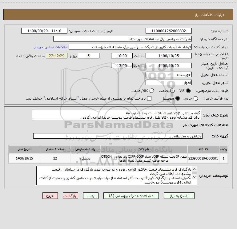 | 1 | 2239300104060001 | تلفن IP تحت شبکه VOIP مدل QIPP-300P نام تجارتی QTECH مرجع عرضه کننده معین نعیم آبادی | دستگاه | 22 | 1400/10/15 |