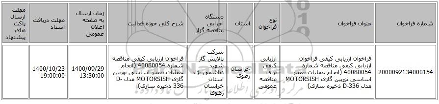مناقصه، فراخوان ارزیابی کیفی فراخوان ارزیابی کیفی مناقصه شماره 40080054 (انجام عملیات تعمیر اساسی توربین گازی MOTORSISH مدل D-336 ذخیره سازی) از کلیه افراد متخصص و شرکتها واجد شرایط دعوت به عمل میآید در مناقصه با کد خبرگزاری پارس نماد: 4075941 شرکت نمایند.