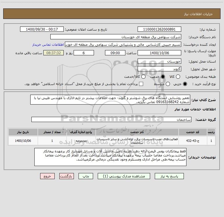 شرح کلی نیاز: تعمیر روشنایی ایستگاه های برق شوشتر و گتوند- جهت اطلاعات بیشتر در تایم اداری با مهندس طیبی نیا با شماره 09163168242 تماس بگیرید.