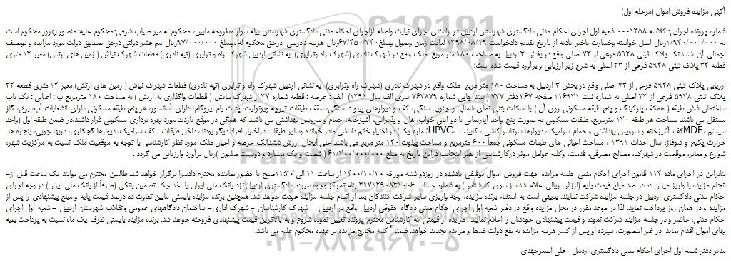 شماره پرونده اجرایی: کلاسه 0001358 شعبه اول اجرای احکام مدنی دادگستری شهرستان اردبیل در راستای اجرای نیابت واصله ازاجرای احکام مدنی دادگستری شهرستان بیله سوار مطروحه مابین، محکوم له میر صیاب شرفی:.محکوم علیه: منصور بهروز محکوم است به 1/940/000/000ریال اصل خواسته وخسارت تاخیر تادیه از تاریخ تقدیم دادخواست 1398/08/19 لغایت زمان وصول ومبلغ67/450/340ریال هزینه دادرسی درحق محکوم له ،ومبلغ 97/000/000ریال نیم عشر دولتی درحق صندوق دولت مورد مزایده و توصیف اجمالی آن: ششدانک پلاک ثبتی 5928 فرعی از 73 اصلی واقع در بخش 3 اردبیل به مساحت 180 متر مربع ملک واقع در شهرک نادری (شهرک راه وترابری) به نشانی اردبیل شهرک راه و ترابری (تپه نادری) قطعات شهرک نیاش ( زمین های ارتش) معبر 12 متری قطعه 32 پلاک ثبتی 5928 فرعی از 33 اصلی به شرح زیر ارزیابی و برآورد قیمت شده است؛