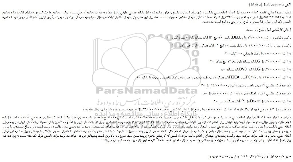 شماره پرونده اجرایی: کلاسه 0001689 شعبه اول اجرای احکام مدنی دادگستری شهرستان اردبیل در راستای اجرای صادره شعبه اول دادگاه عمومی حقوقی اردبیل مطروحه مابین، محکوم له :علی بشیری زنگیر محکوم علیه:شرکت بهینه سازان خاکاب سازه محکوم است به 257/141/537ریال اصل خواسته ومبلغ674/000ریال تعرفه خدمات قضائی درحق محکوم له ،ومبلغ 1/800/000ریال نیم عشر دولتی درحق صندوق دولت مورد مزایده و توصیف اجمالی آن:اموال موجود درآدرس اردبیل کارشناسان میدان فرهنگ کوچه یاسمین یک امین اموال رضا بشیری به شرح زیر ارزیابی و برآورد قیمت شده است؛