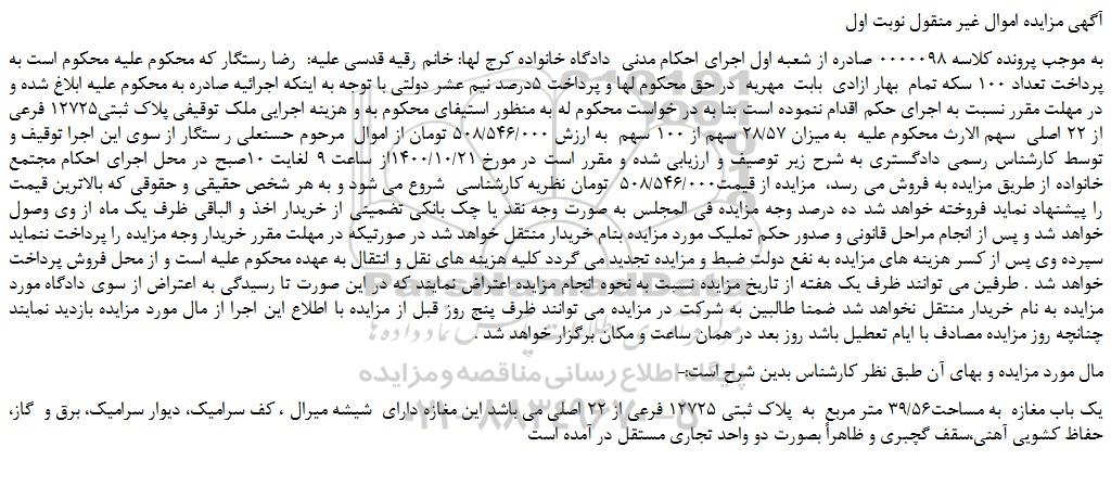 به موجب پرونده کلاسه 0000098 صادره از شعبه اول اجرای احکام مدنی دادگاه خانواده کرج لها: خانم رقیه قدسی علیه: رضا رستگار که محکوم علیه محکوم است به پرداخت تعداد 100 سکه تمام بهار ازادی بابت مهریه در حق محکوم لها و پرداخت 5درصد نیم عشر دولتی با توجه به اینکه اجرائیه صادره به محکوم علیه ابلاغ شده و در مهلت مقرر نسبت به اجرای حکم اقدام ننموده است بنا به در خواست محکوم له به منظور استیفای محکوم به و هزینه اجرایی ملک توقیفی پلاک ثبتی12725 فرعی از 22 اصلی سهم الارث محکوم علیه به میزان 28/57 سهم از 100 سهم به ارزش 508/546/000 تومان از اموال مرحوم حسنعلی ر ستگار از سوی این اجرا توقیف و توسط کارشناس رسمی دادگستری به شرح زیر توصیف و ارزیابی شده و مقرر است در مورخ 1400/10/21از ساعت 9 لغایت 10صبح در محل اجرای احکام مجتمع خانواده از طریق مزایده به فروش می رسد، مزایده از قیمت508/546/000 تومان نظریه کارشناسی شروع می شود و به هر شخص حقیقی و حقوقی که بالاترین قیمت را پیشنهاد نماید فروخته خواهد شد ده درصد وجه مزایده فی المجلس به صورت وجه نقد یا چک بانکی تضمینی از خریدار اخذ و الباقی ظرف یک ماه از وی وصول خواهد شد و پس از انجام مراحل قانونی و صدور حکم تملیک مورد مزایده بنام خریدار منتقل خواهد شد در صورتیکه در مهلت مقرر خریدار وجه مزایده را پرداخت ننماید سپرده وی پس از کسر هزینه های مزایده به نفع دولت ضبط و مزایده تجدید می گردد کلیه هزینه های نقل و انتقال به عهده محکوم علیه است و از محل فروش پرداخت خواهد شد . طرفین می توانند ظرف یک هفته از تاریخ مزایده نسبت به نحوه انجام مزایده اعتراض نمایند که در این صورت تا رسیدگی به اعتراض از سوی دادگاه مورد مزایده به نام خریدار منتقل نخواهد شد ضمنا طالبین به شرکت در مزایده می توانند ظرف پنج روز قبل از مزایده با اطلاع این اجرا از مال مورد مزایده بازدید نمایند چنانچه روز مزایده مصادف با ایام تعطیل باشد روز بعد در همان ساعت و مکان برگزار خواهد شد .