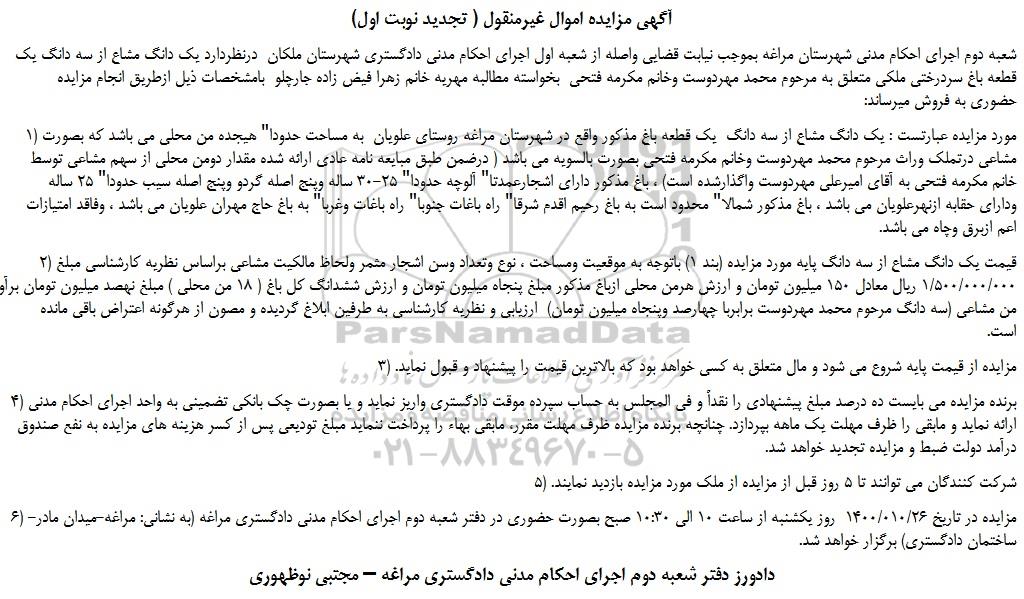 شعبه دوم اجرای احکام مدنی شهرستان مراغه بموجب نیابت قضایی واصله از شعبه اول اجرای احکام مدنی دادگستری شهرستان ملکان درنظردارد یک دانگ مشاع از سه دانگ یک قطعه باغ سردرختی ملکی متعلق به مرحوم محمد مهردوست وخانم مکرمه فتحی بخواسته مطالبه مهریه خانم زهرا فیض زاده جارچلو بامشخصات ذیل ازطریق انجام مزایده حضوری به فروش میرساند: