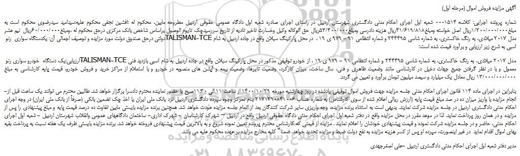 شماره پرونده اجرایی: کلاسه 0001514 شعبه اول اجرای احکام مدنی دادگستری شهرستان اردبیل در راستای اجرای صادره شعبه اول دادگاه عمومی حقوقی اردبیل مطروحه مابین، محکوم له :افشین نجفی محکوم علیه:سیدامید سیدرضوی محکوم است به مبلغ1/200/000/000ریال اصل خواسته ومبلغ41/619/818ریال هزینه دادرسی ومبلغ53/400/000ریال حق الوکاله وکیل وخسارت تاخیر تادیه از تاریخ سررسیدچک تایوم الوصول براساس شاخص بانک مرکزی درحق محکوم له ،ومبلغ60/000/000ریال نیم عشر دولتی درحق صندوق دولت مورد مزایده و توصیف اجمالی آن: یکدستگاه سواری رنو TALISMAN-TCE مدل 2017 میلادی، به رنگ خاکستری، به شماره شاسی 244495 و شماره انتظامی 91 - 979 ی 19 ، در محل پارکینگ سبلان واقع در جاده اردبیل به شام اسبی به شرح زیر ارزیابی و برآورد قیمت شده است؛