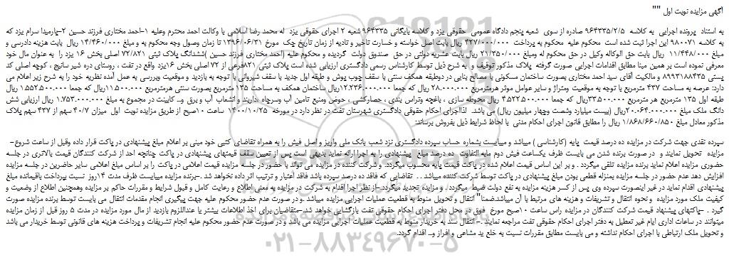 به استناد پرونده اجرایی به کلاسه 964335/2/5 صادره از سوی شعبه پنجم دادگاه عمومی حقوقی یزد و کلاسه بایگانی 964335 شعبه 2 اجرای حقوقی یزد له محمد رضا اسلامی با وکالت احمد محترم وعلیه 1-احمد مختاری فرزند حسین 2-پارمیدا سرام یزد که به کلاسه 980071 این اجرا ثبت شده است محکوم علیه محکوم به پرداخت 427/000/000 ریال بابت اصل خواسته و خسارت تاخیر و تادیه از زمان تاریخ چک مورخ 1396/06/31 تا زمان وصول وجه محکوم به و مبلغ 14/460/000 ریال بابت هزینه دادرسی و مبلغ 11/448/000 ریال بابت حق الوکاله وکیل در حق محکوم له ومبلغ 21/350/000 ریال بابت عشریه دولتی در حق صندوق دولت گردیده و محکوم علیه (احمد مختاری فرزند حسین )ششدانگ پلاک ثبتی 72/821 اصلی بخش 16 یزد را به عنوان مال خود معرفی نموده است بر همین مبنا مطابق اقدامات اجرایی صورت گرفته پلاک مذکور توقیف و به شرح ذیل توسط کارشناس رسمی دادگستری ارزیابی شده است پلاک ثبتی 821فرعی از 72 اصلی بخش 16یزد واقع در تفت ، روستای دره شیر سانیج ، کوچه اصلی کد پستی 8993188435 و مالکیت آقای سید احمد مختاری بصورت ساختمان مسکونی با مصالح بنایی در دوطبقه همکف سنتی با سقف چوب پوش و طبقه اول جدید با سقف شیروانی با توجه به بازدید و موقعیت وبررسی به عمل آمده نظریه خود را به شرح زیر اعلام می دارد: عرصه به مساحت 437 مترمربع با توجه به موقعیت ومتراژ و سایر عوامل موثر هرمترمربع 28.000.000 ریال که جمعا 12.236.000.000ریال ساختمان همکف به مساحت 135 مترمربع بصورت سنتی هرمترمربع 11.500.000ریال که جمعا 1.552.500.000 ریال طبقه اول 135 مترمربع هر مترمربع 33.500.000ریال که جمعا 4.522.500.000 ریال محوطه سازی ، باغچه وتراس بندی ، حصارکشی ، حوض ومنبع تامین آب وسرچاه ،داربند و انشعاب آب و برق و... کابینت در مجموع به مبلغ 1.753.000.000 ریال ارزیابی شش دانگ ملک مبلغ 20.064.000.000ریال (بیست میلیارد وشصت وچهار میلیون ریال) می باشد. لذااجرای احکام حقوقی دادگستری شهرستان تفت در نظر دارد در مورخه 1400/10/25 ساعت 10صبح از طریق مزایده نوبت اول میزان 40/7 سهم از 437 سهم پلاک مذکور معادل مبلغ 1/868/660/850 ریال را مطابق قانون اجرای احکام مدنی با لحاظ شرایط ذیل بفروش برساند: