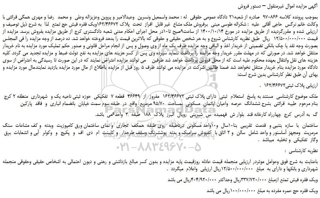 بموجب پرونده کلاسه 970866 صادره از شعبه21 دادگاه عمومی حقوقی له : محمد واسمعیل ونسرین وعبدالامیر و پروین وعزیزاله وعلی و محمد رضا و مهری همگی قرائتی با وکالت خانم نرگس حاجی آقائی علیه : شکراله طوسی مبنی برفروش ملک مشاع غیر قابل افراز تحت پلاک 162/46672ویک فقره فیش حج تمتع لذا به شرح ذیل توصیف و ارزیابی شده و مقررگردیده از طریق مزایده در مورخ 1400/10/14 از ساعت9صبح تا10در محل اجرای احکام مدنی شعبه دادگستری کرج از طریق مزایده بفروش برسد. مزایده از قیمت 12/500/000/000 ریال طبق نظریه کارشناس شروع و به هر شخص حقیقی و حقوقی که بالاترین قیمت را بدهد فروخته خواهد شد. ده درصد از وجه مزایده را فی المجلس بصورت وجه نقد یا چک بانکی تضمینی از خریدار اخذ و الباقی وجه مزایده ظرف یک ماه از وی وصول و پس از انجام مراحل قانونی و صدور حکم تملیک مورد مزایده به نام خریدار منتقل خواهد شد. در صورتی که در مهلت مقرر خریدار وجه مزایده را پرداخت ننماید سپرده وی پس از کسر هزینه های مزایده به نفع دولت ضبط و مزایده تجدید می گردد. کلیه هزینه های نقل وانتقال بعهده محکوم علیه است که از محل فروش پرداخت خواهد شد طرفین می توانند مزایده اعتراض نمایند که در این صورت تا رسیدگی به اعتراض از سوی دادگاه مورد مزایده بنام خریدار منتقل نخواهد شد ضمنا طالبین شرکت در مزایده می توانند ظرف 5 روز قبل از مزایده بااطلاع از مال مورد مزایده بازدید نمایند.مال مورد مزایده و بهای آن طبق نظر کارشناس بدین شرح است: