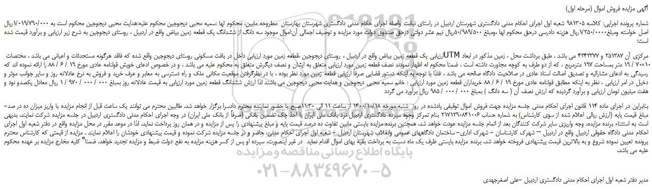 شماره پرونده اجرایی: کلاسه 981305 شعبه اول اجرای احکام مدنی دادگستری شهرستان اردبیل در راستای نیابت واصله اجرای حکام مدنی دادگستری شهرستان بهارستان مطروحه مابین، محکوم لها :سمیه محبی دیجوجین محکوم علیه:هدایت محبی دیجوجین محکوم است به 1/019/790/000ریال اصل خواسته ومبلغ1/250/0000ریال هزینه دادرسی درحق محکوم لها ،ومبلغ 50/989/500ریال نیم عشر دولتی درحق صندوق دولت مورد مزایده و توصیف اجمالی آن:اموال موجود سه دانگ از ششدانگ یک قطعه زمین بیاض واقع در اردبیل ، روستای دیجوجین به شرح زیر ارزیابی و برآورد قیمت شده است؛