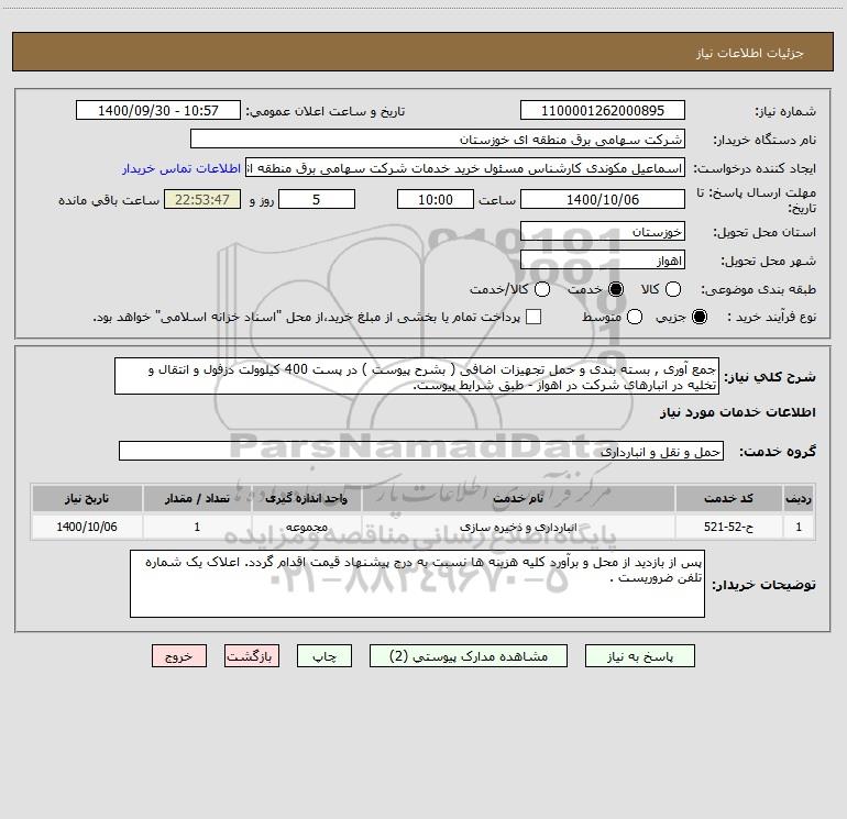شرح کلی نیاز: جمع آوری , بسته بندی و حمل تجهیزات اضافی ( بشرح پیوست ) در پست 400 کیلوولت دزفول و انتقال و تخلیه در انبارهای شرکت در اهواز - طبق شرایط پیوست.