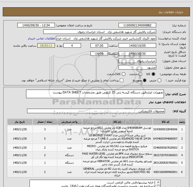 نام دستگاه خریدار:شرکت پالایش گاز شهید هاشمی نژاد استان خراسان رضوی