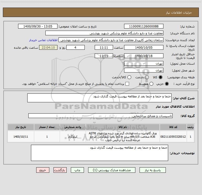 استعلام بها و موضوع استعلام استعلام حتما و حتما و حتما بعد از مطالعه پیوست قیمت گذاری شود به اطلاع کلیه شرکتها و افراد متخصص واجد شرایط میرساند، آگهی گذار در نظر دارد از طریق استعلام بها، نسبت به انتخاب و دریافت پیشنهادات اقدام نماید. این استعلام با کد آگهی ثبت شده در سامانه خبرگزاری پارس نماد : 4079457 منتشر شده است. مشخصات استعلام : تاریخ شروع استعلام: 1400/09/30 آخرین مهلت ارسال پیشنهاد قیمت : 1400/10/04 و محل اجرای پروژه : استان تهران میباشد. استعلام قیمت مورد درخواست : استعلام حتما و حتما و حتما بعد از مطالعه پیوست قیمت گذاری شود با دستهبندیهای تخصصی و گروه های مرتبط : انواع ورق, گالوانیزه, مصالح ساختمانی, استعلام اطلاع رسانی میگردد.