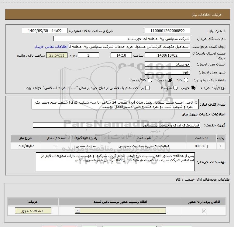 شرح کلی نیاز: تامین امنیت پست شقایق بخش میان آب ( بصورت 24 ساعته با سه شیفت کاری) شیفت صبح وعصر یک نفره و شیفت شب دو نفره مسلح طبق دستورالعمل پیوست.