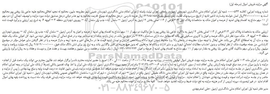 شماره پرونده اجرایی: کلاسه 0000544 شعبه اول اجرای احکام مدنی دادگستری شهرستان اردبیل در راستای اجرای نیابت واصله ازاجرای احکام مدنی دادگستری شهرستان خمینی شهر مطروحه مابین، محکوم له :مجید اعلائی.محکوم علیه: حاجی بابا روغنی پور محکوم است به 470/000/000ریال اصل خواسته وخسارت تاخیر تادیه از تاریخ سررسیدچک لغایت زمان وصول ومبلغ16/985/858ریال هزینه دادرسی درحق محکوم له ،ومبلغ 5درصد محکوم به نیم عشر دولتی درحق صندوق دولت مورد مزایده و توصیف اجمالی آن: دو سهم از 11 سهم مشاع به انضمام بهای ثمنیه از عرصه و اعیان ملک به مشخصات پلاک ثبتی 314 فرعی از 114 اصلی بخش 3 اردبیل به آدرس اردبیل – سلمان آباد- جنب پل سلمان آباد – روبروی شهرداری منطقه 4 – کوچه 6 به شرح زیر ارزیابی و برآورد قیمت شده است؛