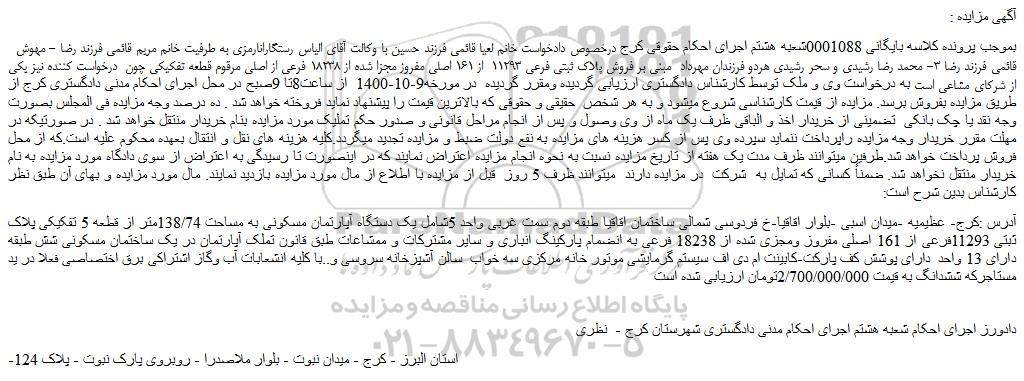 بموجب پرونده کلاسه بایگانی 0001088شعبه هشتم اجرای احکام حقوقی کرج درخصوص دادخواست خانم لعیا قائمی فرزند حسین با وکالت آقای الیاس رستگارانارمزی به طرفیت خانم مریم قائمی فرزند رضا - مهوش قائمی فرزند رضا 3- محمد رضا رشیدی و سحر رشیدی هردو فرزندان مهرداد  مبنی بر فروش پلاک ثبتی فرعی 11293  از 161 اصلی مفروز مجزا شده از 18238 فرعی از اصلی مرقوم قطعه تفکیکی چون  درخواست کننده نیز یکی از شرکای مشاعی است به درخواست وی و ملک توسط کارشناس دادگستری ارزیابی گردیده ومقرر گردیده  در مورخه9-10-1400  از ساعت8تا 9صبح در محل اجرای احکام مدنی دادگستری کرج از طریق مزایده بفروش برسد. مزایده از قیمت کارشناسی شروع میشود و به هر شخص  حقیقی و حقوقی که بالاترین قیمت را پیشنهاد نماید فروخته خواهد شد . ده درصد وجه مزایده فی المجلس بصورت وجه نقد یا چک بانکی  تضمینی از خریدار اخذ و الباقی ظرف یک ماه از وی وصول و پس از انجام مراحل قانونی و صدور حکم تملیک مورد مزایده بنام خریدار منتقل خواهد شد . در صورتیکه در مهلت مقرر خریدار وجه مزایده راپرداخت ننماید سپرده وی پس از کسر هزینه های مزایده به نفع دولت ضبط و مزایده تجدید میگردد.کلیه هزینه های نقل و انتقال بعهده محکوم علیه است.که از محل فروش پرداخت خواهد شد.طرفین میتوانند ظرف مدت یک هفته از تاریخ مزایده نسبت به نحوه انجام مزایده اعتراض نمایند که در اینصورت تا رسیدگی به اعتراض از سوی دادگاه مورد مزایده به نام خریدار منتقل نخواهد شد. ضمناً کسانی که تمایل به  شرکت  در مزایده دارند  میتوانند ظرف 5 روز  قبل از مزایده با اطلاع از مال مورد مزایده بازدید نمایند. مال مورد مزایده و بهای آن طبق نظر کارشناس بدین شرح است: