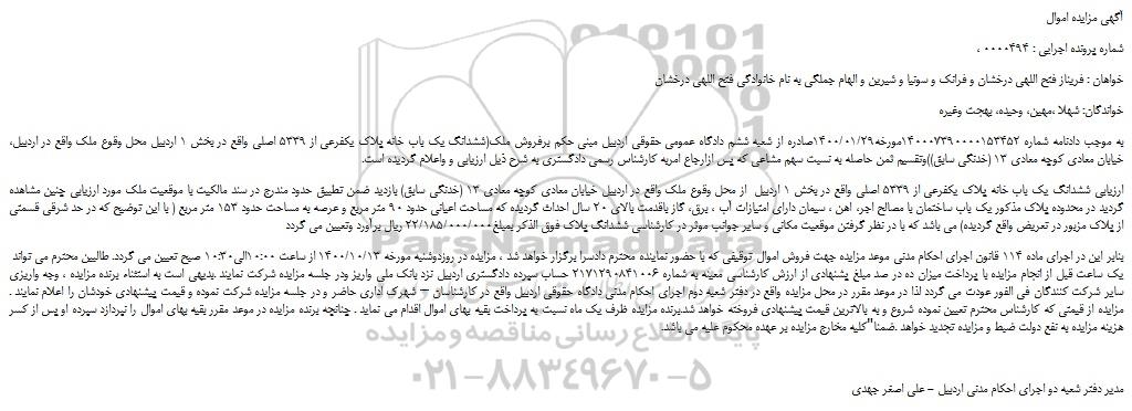 ،به موجب دادنامه شماره 140007390000153452مورخه1400/01/29صادره از شعبه ششم دادگاه عمومی حقوقی اردبیل مبنی حکم برفروش ملک(ششدانگ یک باب خانه پلاک یکفرعی از 5339 اصلی واقع در بخش 1 اردبیل محل وقوع ملک واقع در اردبیل خیابان معادی کوچه معادی 13 (خدنگی سابق))وتقسیم ثمن حاصله به نسبت سهم مشاعی که پس ازارجاع امربه کارشناس رسمی دادگستری به شرح ذیل ارزیابی و واعلام گردیده است.