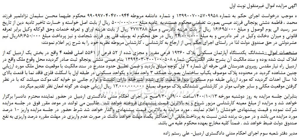 ه موجب درخواست اجرای حکم به شماره 1399007005709958 و شماره دادنامه مربوطه 9909970404700944 محکوم علیهما محسن سلیمان نژادلمیر فرزند محمد ، فاطمه دشتی یونجالی فرزند عیسی بصورت تضامنی محکوم هستند به تادیه مبلغ 500/000/000 ریال از بابت اصل خواسته و خسارت تاخیر تادیه دین از تاریخ سر رسید الی یوم الوصول و مبلغ 16/695/000 ریال از بابت هزینه دادرسی و مبلغ 377/388 ریال از بابت هزینه اوراق و تعرفه خدمات وحق الوکاله وکیل برابر تعرفه قانونی و میزان دخالت وکیل در امر دادرسی و به مبلغ 24/000/000 ریال در حق محکوم له یوسف قلی پور فرزند شجاعت و نیز پرداخت مبلغ 86/650/000ریال نیم عشردولتی در حق صندوق دولت لذا در راستای اجرای حکم پس از ارجاع به کارشناسی ، کارشناس مربوطه نظریه خود را به شرح زیر اعلام نمودند: